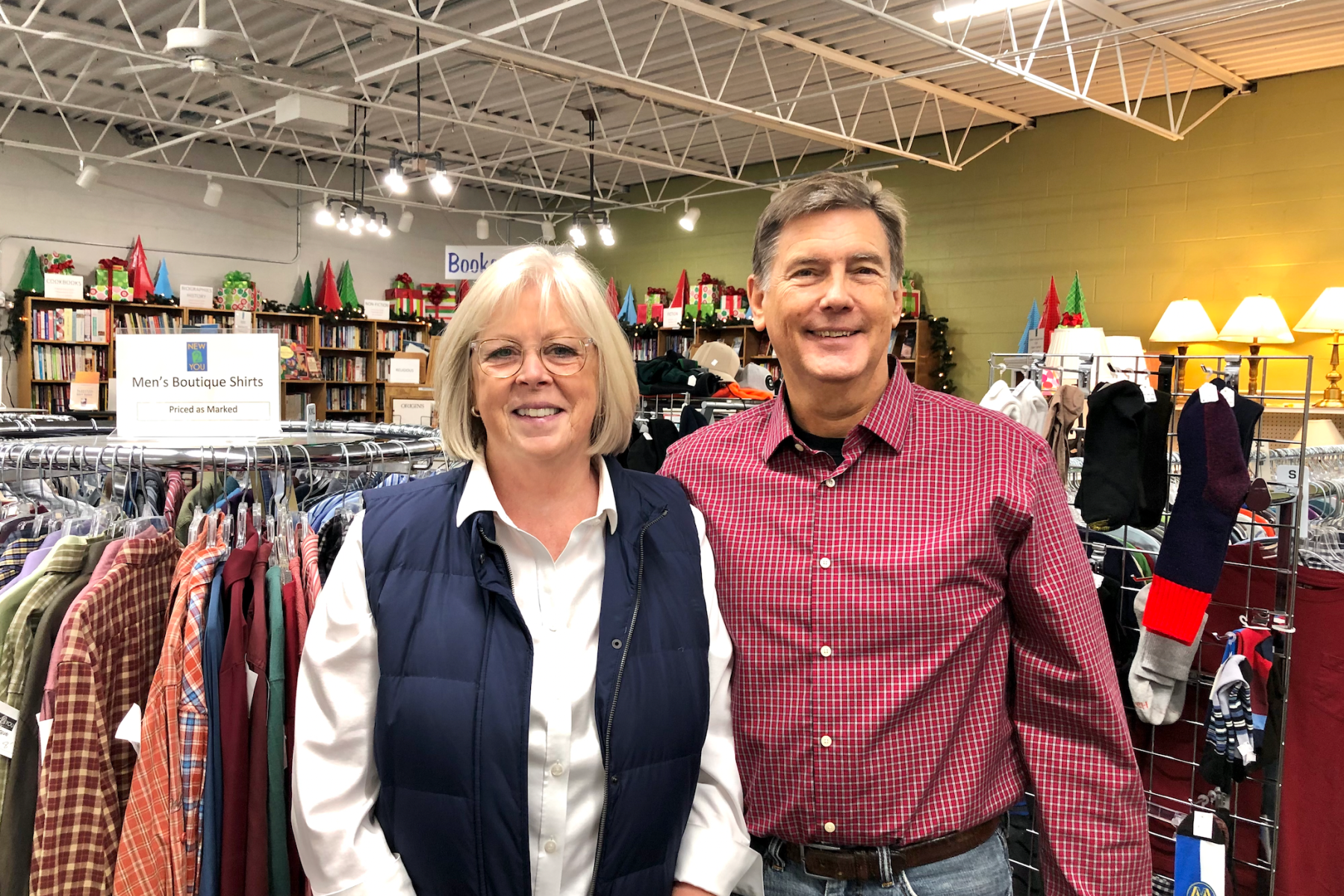 Meet Bernie and Dan, one of the fantastic volunteer couples at New 2 You that each use their gifts in vastly different ways to serve! Bernie began volunteering at New 2 You about six years by cashiering while doing our store’s bookkeeping remotely. Dan started volunteering about two and a half years ago in the men’s clothing department and is now the department manager.