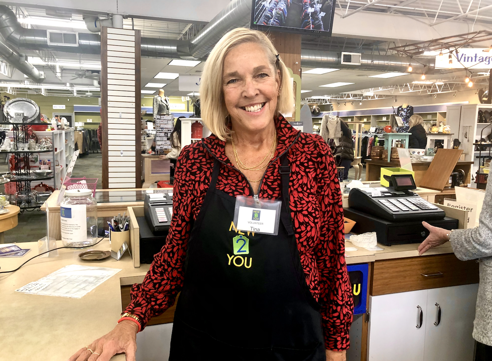 In volunteering, Tina most looks forward to meeting new friends—customers and volunteers— and engaging with the New 2 You community of wonderful people. She deeply enjoys group devotions each morning before opening, and is so thankful to be part of a community that she feels comfortable in.