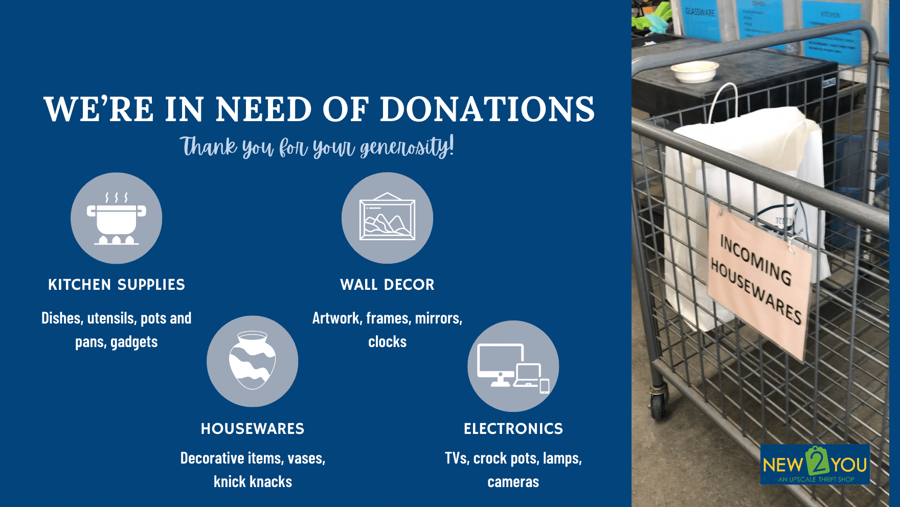 Friends, we would greatly appreciate your donations during this season. We are especially looking for housewares, wall decor, kitchen supplies, and electronics. We love being able to take unwanted items out of your hands and help them find a new home while supporting a great cause.